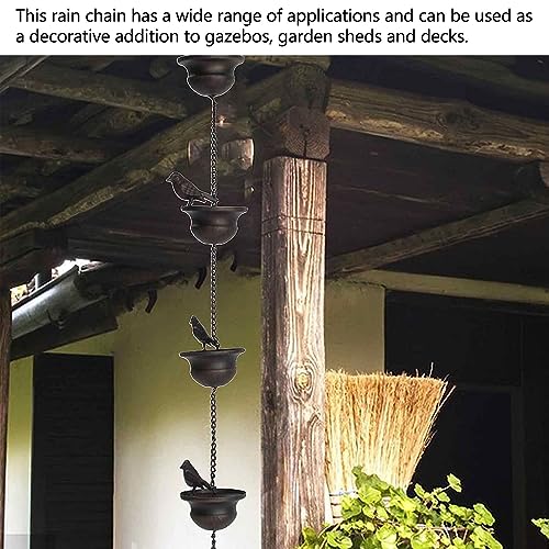 This rain chain features a 3.4-inch diameter moving birdie and comes with a cup to direct rainwater down the chain and collect into a bucket, pail, or spray can